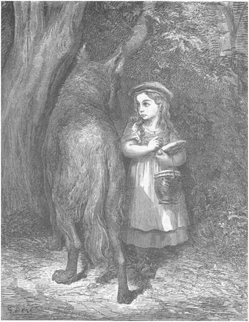 En el primer cuento elegido, La caperucita roja, en la ilustración de Gustav Doré (1883) para la versión de Perrault el punto de vista del ilustrador enfatiza la figura del lobo como la amenaza, en lo que podría ser una hipérbole visual; la figura maximizada del lobo podría representar el temor de la niña. El protagonista es el lobo, que no está humanizado porque de esa manera se suavizaría su ferocidad, el eufemismo no es pertinente en esta representación. El ilustrador lo representa icónicamente como lo que es, una fiera. La imagen de la niña, que no lleva su caperuza roja, pero sí lleva el tarrito de mermelada y la mantequilla para su abuela enferma, lo mira con cierta inocencia. El lobo representa el engaño, la argucia; el bosque podría ser la metáfora del peligro, un lugar oscuro donde se oculta el que miente. En esta versión, otro de los personajes es la abuela que corre con la misma suerte de su confiada nieta, ambas son devoradas por el lobo. En esta composición se enfrentan las dos figuras antagonistas, en una oposición entre la malicia y la inocencia. En la configuración iconográfica de este relato, el ilustrador pone en evidencia su punto de vista sobre la historia al centrarse en la imagen amenazante del lobo, símbolo del peligro que contempla a los ojos a la niña, su víctima.
