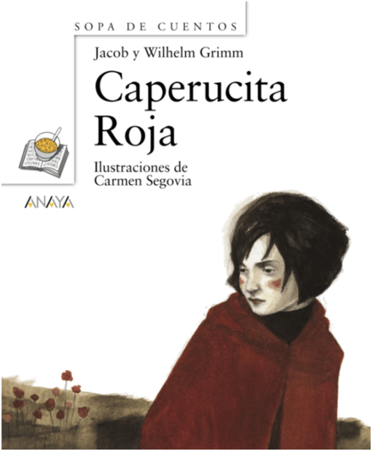 En la segunda ilustración elegida sobre la adaptación de los hermanos Grimm, la niña aparece en primer plano, en soledad, con el elemento que identifica al personaje: la caperuza roja. Al fondo de la imagen aparece un campo con flores también rojas. A nivel iconográfico, la figura de la amenaza, del peligro latente está ausente de la representación visual. Se utiliza la caperuza roja como elemento distintivo del personaje. En este caso se podría considerar que el punto de vista de la ilustradora –Carmen Segovia– se evidencia en el estado anímico que se refleja en el rostro de la niña, se la puede ver algo abatida, preocupada por un peligro que la circunda pero que no se deja ver. Otro elemento original son los corazones marcados en sus mejillas, como en las flores del campo; esto podría interpretarse como una referencia metonímica a un desarrollo incipiente, una sensualidad latente que se connota en la figura del lobo en el relato. En la soledad del personaje el peligro está implícito, a nivel de las emociones se podría percibir un cierto desasosiego en la mirada de soslayo de la niña hacia el que todavía, no se deja ver.