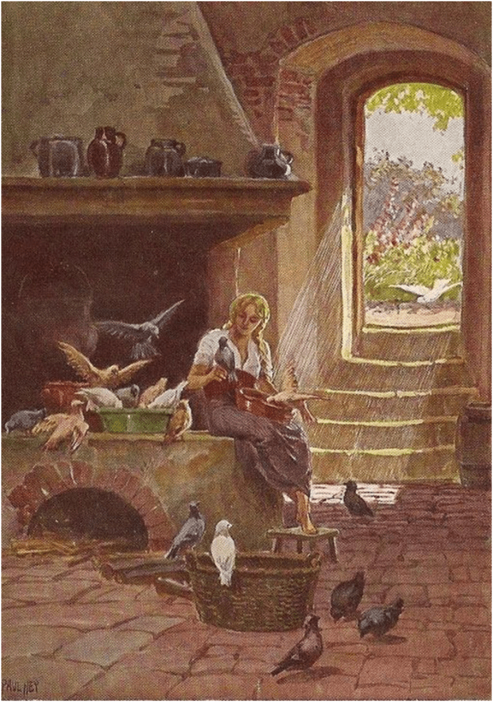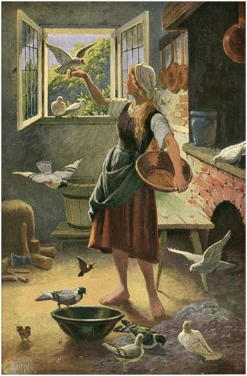 En esta otra ilustración se ve a la protagonista en la cocina rodeada de palomas y aves, la paloma que se posa en la mano de Cenicienta parece reconocer la belleza interior de la protagonista, las demás la rodean consolándola en su soledad. En el relato las aves la están ayudando a recoger las lentejas que la madrastra arrojaba al piso para que Cenicienta las juntara, si terminaba a tiempo podía ir al baile. La protagonista está descalza y pobremente vestida, es la heroína que sufre para luego alcanzar su redención. En este relato son también las aves las que visten y transforman a la joven para que pueda asistir al baile.