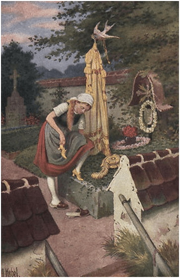 En esta ilustración se ve a la joven que visita la tumba de su madre, se puede percibir la tristeza, la soledad como emociones, y aparece el elemento mágico o sobrenatural que distingue a esta versión de los Hnos. Grimm de otras: las aves como protectoras de la protagonista. En una referencia metafórica las aves que asisten a Cenicienta, especialmente el ave blanca que está subida al almendro que ella sembró en la tumba de su madre; podría interpretarse como una referencia analógica a un espíritu bondadoso que viene a consolarla. Ya en el Génesis la paloma representa la paz y la reconciliación, que en esta historia es lo que falta en el hogar de la joven. Estas aves tienen el poder de darle a Cenicienta lo que ella les pide: un vestido de oro y plata, y zapatos nuevos para ir al baile.