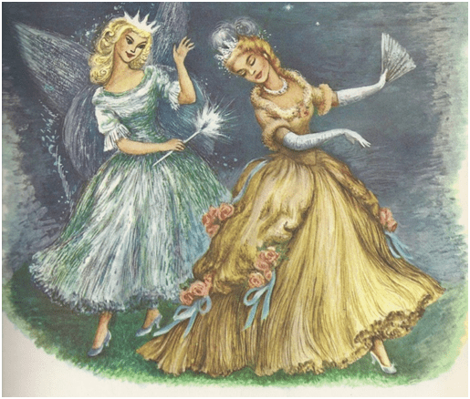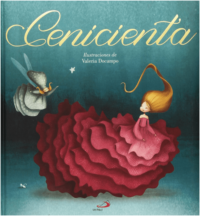 En otro género discursivo, en esta ilustración literaria se enfatiza mediante una hipérbole visual a Cenicienta con un magnífico vestido rojo con volados, el elemento disonante es el color como símbolo de la pasión amorosa de la heroína, que se diferencia de los tonos celestes del género cinematográfico. En un segundo plano aparece el hada madrina flotando en el aire, con dos elementos icónicos la varita mágica y las alas. En un tercer plano aparece lo que se podría considerar una lítote, en la minimización del zapato de cristal, elemento retórico secundario en esta escenografía. La escena representada es la de mayor tensión narrativa, la transformación de Cenicienta.