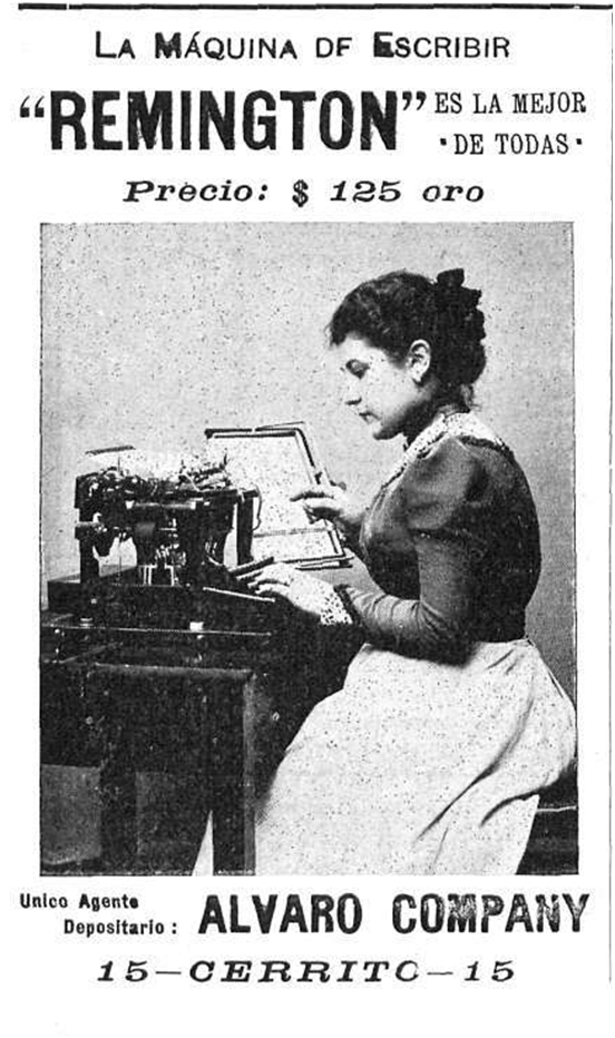 Con relación a estas tareas administrativas, se puede observar uno de los primeros avisos publicados en el año 1900 por la marca Remington, marca icónica en la industria de las máquinas de escribir. La marca era posicionada según su eslogan como “Es la mejor de todas”, lo interesante para este contexto de análisis es la imagen de una mujer representando una oficinista de la época. La composición verbo-icónica de la pieza incluye a nivel de la enunciación visual la imagen de perfil de una mecanógrafa en situación de uso del objeto promocionado. A nivel referencial se menciona el precio del producto y el lugar donde podía ser adquirido. El nombre del emisor comercial “Alvaro Company” aparece al pie del aviso como el enunciatario responsable. En los comienzos del siglo 20 aparecían los primeros indicios de un proceso de feminización de las tareas administrativas donde la imagen femenina se asociaba a un trabajo de secretaria/mecanógráfa.