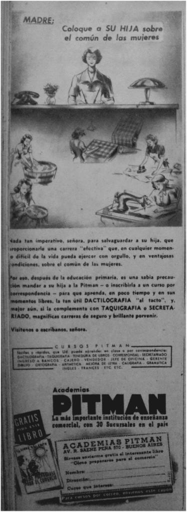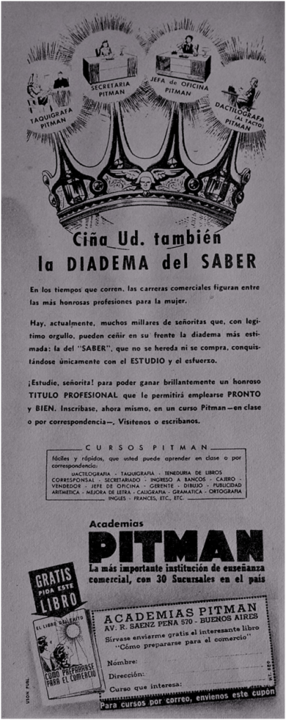 Una de las grandes marcas anunciantes dentro de la categoría Oficina/Trabajo Administrativo fue Academias Pitman –fundada en 1919, cerró en 1993- que desde mediados de 1930 fue la gran comunicadora de la capacitación profesional para el empleo administrativo, en Argentina. Desde su eslogan se posicionaba como “La más importante institución de enseñanza comercial, con más de 30 Sucursales en el país”. Según Queirolo (2014) luego de la crisis económica de 1930, el sector administrativo experimentó una reactivación que generó una suba en la demanda del sector comercial. En el sector educativo no se alcanzaba a suplir la demanda del mercado laboral de personal calificado en tareas comerciales, ante esta necesidad surge la modalidad de la Academia formadora para el empleo en oficinas. La propuesta educativa de Academias Pitman estaba dirigida a un sector de la población trabajadora que necesitaba resolver una búsqueda laboral y su capacitación de manera ágil y accesible. Su propuesta diferencial –respecto de la educación por correspondencia de fines del siglo 19– radicaba en su presencia física en los barrios con más de 30 sucursales en la ciudad de Buenos Aires y una temática de capacitación comercial. A nivel discursivo, Pitman como enunciador compartió representaciones gráficas con las demás instituciones de educación informal de la época construidas en torno a dos ejes: la movilidad ocupacional ascendente y las jerarquías de género entre varones y mujeres. Queirolo (2014) enfatiza “insistiremos en la noción de capacitación profesional que dotó a los empleados de saberes específicos que le permitieron diferenciarse de los empleados que no los poseían y, de esa manera, aspirar a la movilidad ocupacional” (p. 4). Sin embargo, la capacitación profesional no fue equitativa para hombres y mujeres, preparando a estas últimas para posiciones subordinadas con una desventaja salarial. Esto devino en la feminización de ciertas ocupaciones como dactilógrafa y taquígrafa-dactilógrada, luego secretarias.