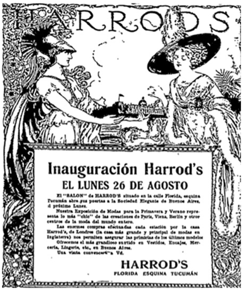 Tienda Harrods fue inaugurada en 1912, y entre 1913 y 1914 se culminó su construcción. En su discurso publicitario se apelaba al público femenino y la mujer era representada como una diosa griega con una maqueta a escala de la tienda, y a su lado una mujer aristocrática como antonomasia de su audiencia. En su enunciación se apelaba al consumo de las mujeres de clase alta, percibido como la actividad femenina por excelencia.