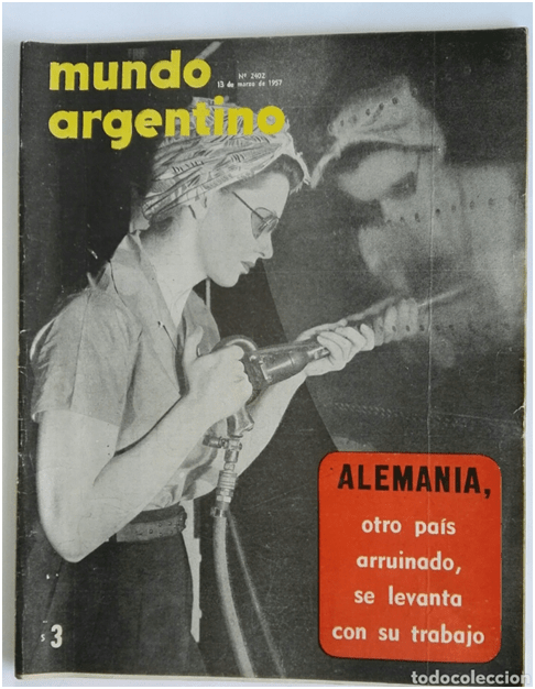 En una tapa del semanario Mundo Argentino de marzo de 1957 se observa una mujer sosteniendo una herramienta de trabajo en una escenografía que denota una ocupación en el ámbito de la industria. El texto enuncia: “Alemania: otro país arruinado se levanta con su trabajo” en una referencia a la época de posguerra en Europa donde el trabajo es ensalzado como variable de recuperación. La revista se posicionaba mediante su eslogan “La revista para toda la República” haciendo referencia a su distribución nacional, y su temática se presentaba en la tapa abarcando: Notas de actualidad-Cuentos-Historietas-Páginas para la mujer.