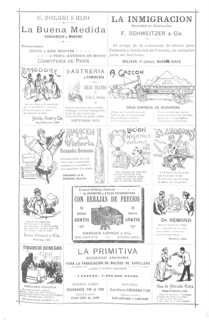 La presencia literal o implícita de las mujeres en el ámbito del trabajo en la prensa gráfica de fines de siglo 19, permite realizar algunos recorridos de lectura en función de los signos utilizados y sus significados. Los anuncios publicitarios comienzan a cobrar relevancia en las publicaciones periódicas. Según Pessi (2010), la Argentina ingresó hacia fines del siglo 19 al llamado proceso de modernización que estuvo acompañado de una serie de cambios a nivel político, económico y social. El periodismo fue parte de este proceso de cambios y transformaciones a partir de la aparición de diferentes publicaciones que se caracterizaron por una innovadora estética gráfica y por la nueva temática dirigida a públicos heterogéneos. La inmigración, llegada principalmente de Europa, introdujo cambios demográficos en el país y generó un público lector con necesidades e intereses diversos. La revista Caras y Caretas “Semanario festivo, literario, artístico y de actualidades” se publicó por primera vez el 8 de octubre de 1898 era una revista semanal que cubría todas las facetas de la vida de la época: actualidad, eventos sociales, política, notas de color, notas para la mujer y narraciones literarias. Su propuesta estaba dirigida a mercados heterogéneos y amplios y se caracterizó por el uso de la ilustración, la articulación entre contenidos y publicidad en sus páginas, por un diseño gráfico con una identidad visual y una estética innovadora. Considerada la primera publicación periódica con características masivas y modernas, seguida por revistas como El Hogar (1904-1962), la revista Para Ti (1922), donde la publicidad desempeñaba un rol decisivo en el crecimiento de la industria gráfica.