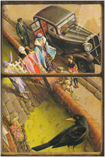 Para el momento narrativo clave del baile en el palacio, Innocenti propone un punto de vista muy diferente recreando una nueva historia dentro del relato. El observador –que está oculto- y se infiere que es la protagonista, observa detrás de una ventana la partida de las hermanastras hacia la fiesta. El contexto de la década del veinte se recrea en el automóvil y en el vestuario de época. En esta propuesta aparece la imagen de un ave, un cuervo negro posado en el alféizar de la ventana; connotando el misterio y el ocultamiento de quien observa en una situación emocional de encierro y tristeza. La función de Prohibición se connota en el encierro por la orden de no participar del baile. Como referencia metonímica también a las emociones negativas vinculadas a las hermanastras, el cuervo es un ave con una carga simbólica asociada al mal, la oscuridad.