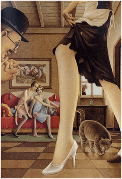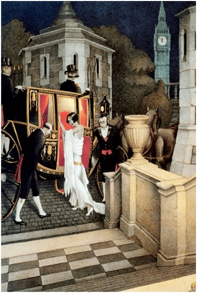 En oposición a esta situación se puede ver a la heroína transformada –función de Transfiguración– en la joven de vestido de noche blanco, a punto de subir a su carroza –elemento que crea un lazo con el relato original- con los lacayos con uniforme que la escoltan. De los cuatro lacayos, uno de ellos conserva los rasgos de los seis lagartos que habían sido convertidos por el hada madrina, en este cuadro aparece casi al margen un elemento fantástico a través de la metonimia. El cochero con los gruesos bigotes refiere a una de las grandes ratas elegidas para la función. Los elementos contextuales del diseño de su vestido, el estilo del peinado corresponden a la moda de los años veinte. Al fondo el detalle que ubica geográficamente, el Big Ben o Torre de Isabel como referente cultural de Londres.