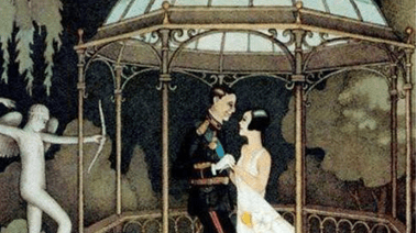 El momento del baile se representa con una escena debajo de un gazebo –variante de esta versión ilustrada– con la referencia metonímica a la orquesta en la sombra reflejada. También aparece la imagen de un pavo real, en consonancia con la iconografía de lujo del palacio aludido.