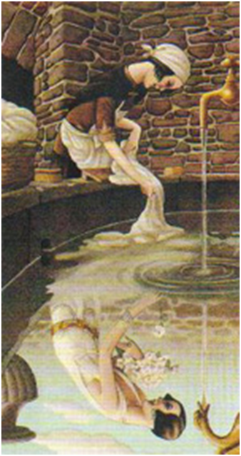 En esta obra, en la escena que ubica a la protagonista en uno de sus momentos de trabajo doméstico, se la puede ver reclinada en un estanque de agua lavando ropa. En un universo narrativo de lo fantástico, se duplica la representación estereotipada del trabajo doméstico con una imagen en el espejo de agua que la muestra en otro plano, el mágico. Así se la puede ver en una oposición de sentido conservando la pose y el gesto pero vestida mágicamente con un vestido de fiesta; todos los elementos del universo de lo real se han convertido fantásticamente en elementos donde ella aparece con un vestido lujoso, sosteniendo flores en vez de la ropa a lavar; la canilla es un cisne de oro. El ilustrador como narrador que recrea una escena de lo cotidiano y la transforma con el recurso de la imagen en espejo, en un cuento de hadas. Según la reflexión de Viegas (s.f.):